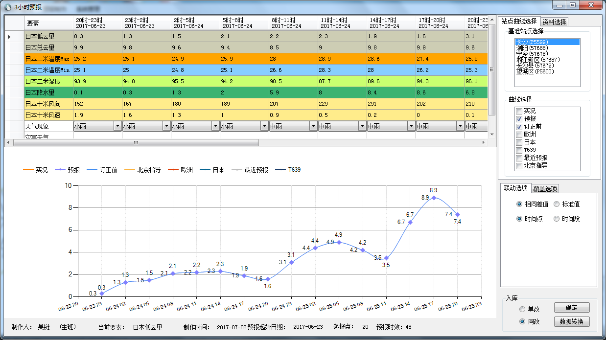 湖南省长沙市精细化预报制作系统主要基于日本、欧洲、T639精细化格网预报数据,完成数值预报场站点数据计算、客观场站点订正、本地化精细化预报服务产品制作及对外服务等功能。在精细化预报制作系统中,可选择数值预报场、客观场的站点数据、最近预报数据等,完成本地化精细化预报产品的分析制作,通过上下图表联动的方式完成数据调整及服务产品制作。